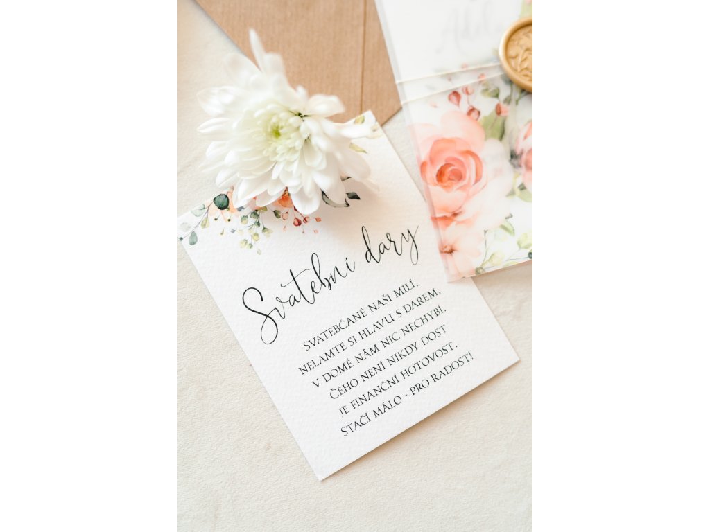 Básničku si môžete vybrať akúkoľvek s ohľadom na veľkosť kartičky, pre kratšie básničky maximálne na dva riadky môžete vziať aj kartičku vo veľkosti pozvania ku stolu. Chcete sa inšpirovať, čo na kartičky napísať? Prečítajte si článok o tom, ako si povedať o svadobné dary na našom blogu.