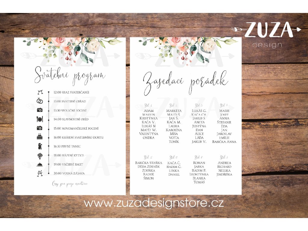 Uvítací plagát, program, menovky, zasadací poriadok, samolepiace etikety na fľaše, svadobné menu a ďalšie doplnky si môžete pozrieť na tomto odkaze.